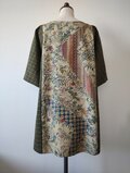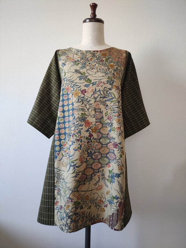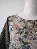 シックな色使いの野草と幾何学模様の着物だった生地に格子柄の紬織を組み合わせたチュニックとなります。