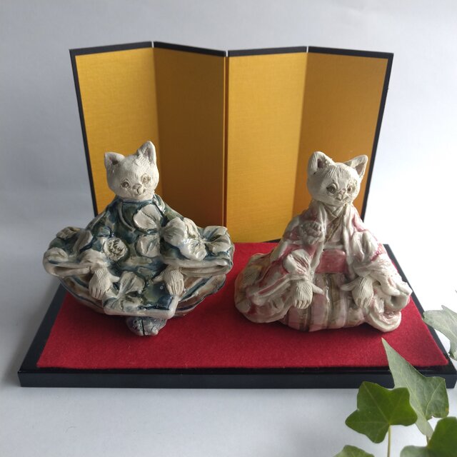 衣装にクローバーをデザインした、ねこ雛人形です。