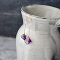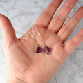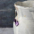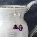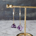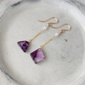 こちらは台形とひし形の小粒のトラピッチェアメジストを使ったロングピアス。クリアなベースの中に放射状の幾何学模様の断片がちらばった表情豊かなピースをです。ホワイトジルコンと淡水パールをあわせています。ノーブルな紫が耳元を華やかに彩ります。個性的でありながら上品なアクセサリーをお探しの方におすすめです。