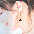 放射状の幾何学模様を内包した希少なアメジスト「トラピッチェアメジスト」のスライスタンブルを使ったピアス。結晶が成長する過程で自然が描いたその模様は、まるで石の中に小さな宇宙があるよう。ひとつとして同じ表情のない、唯一無二の魅力を耳元に添えるピアスです。