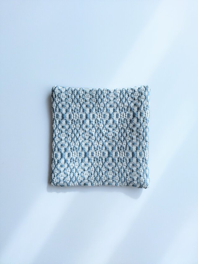 経糸に白い綿糸、緯糸にくすんだ水色の麻糸を用い、オーバーショット織りでコースターに仕立てました。