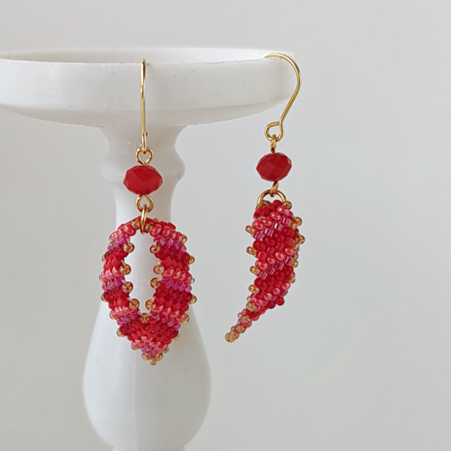 どんな赤系アイテムとも合うよう、マゼンタから朱赤まで4種類の赤いビーズを使いました