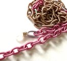 メガネに取り付ける部分のチェーン左右の端の部分に エナメル加工された軽い金属を輸入して使っています。