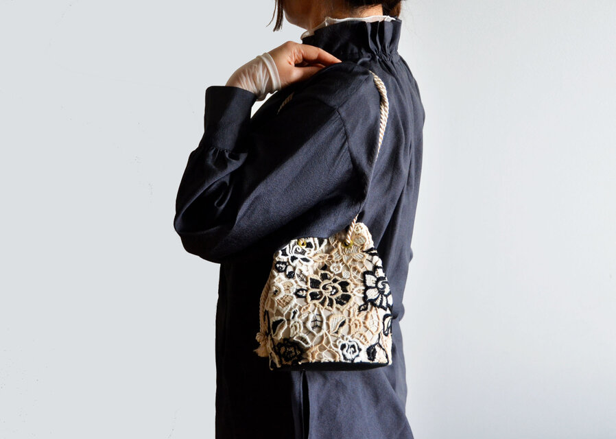 ブラック、ホワイト、ベージュの糸が混ざり合って、なんとも華やかで美しいケミカルレースポシェットマリンバッグのご紹介です!