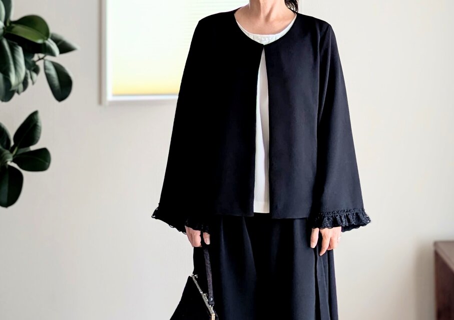 ワンピースの上に重ねても、シンプルなブラウスに重ねてもフォーマルシーンで大活躍します(^^)長袖なのも安心◎