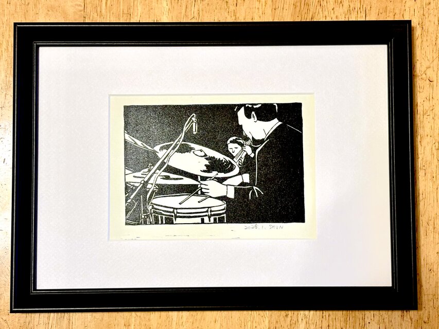 すでに出品している木版画、ビルエバンスとスコットラファロと、このポールモチアンで、これでトリオ完成でございます☺︎