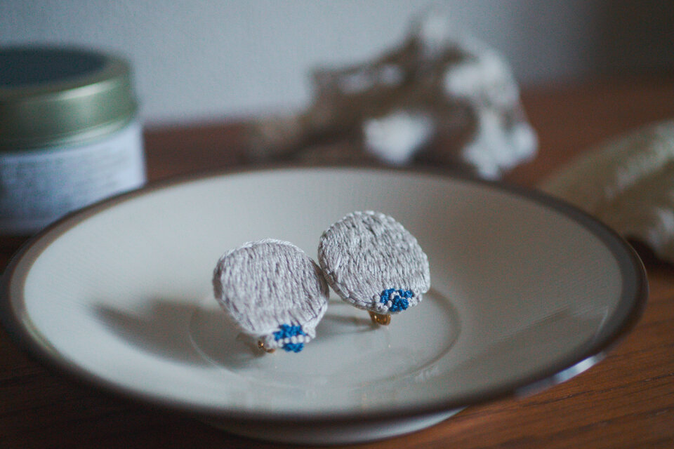 星の光に照らされて輝く月桃の花をイメージした、銀色の刺繍糸の輝きが美しい刺繍イヤリングです。