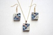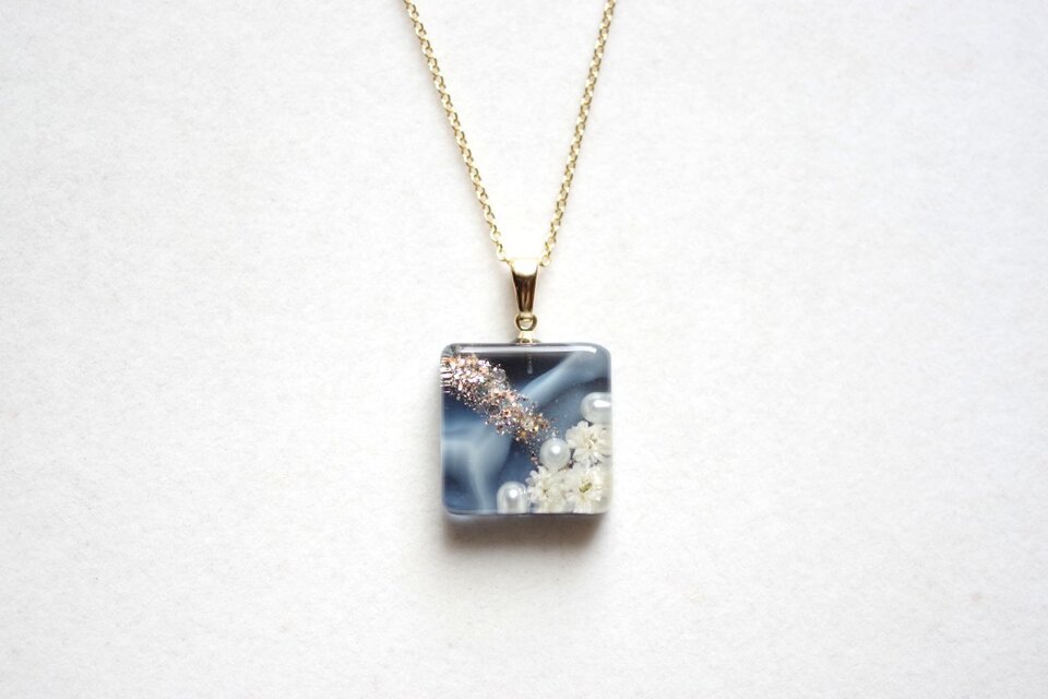 落ち着いたブルーの背景にお花やパールを配置し、ラメと白いラインを置いたデザインが上品なペンダント。