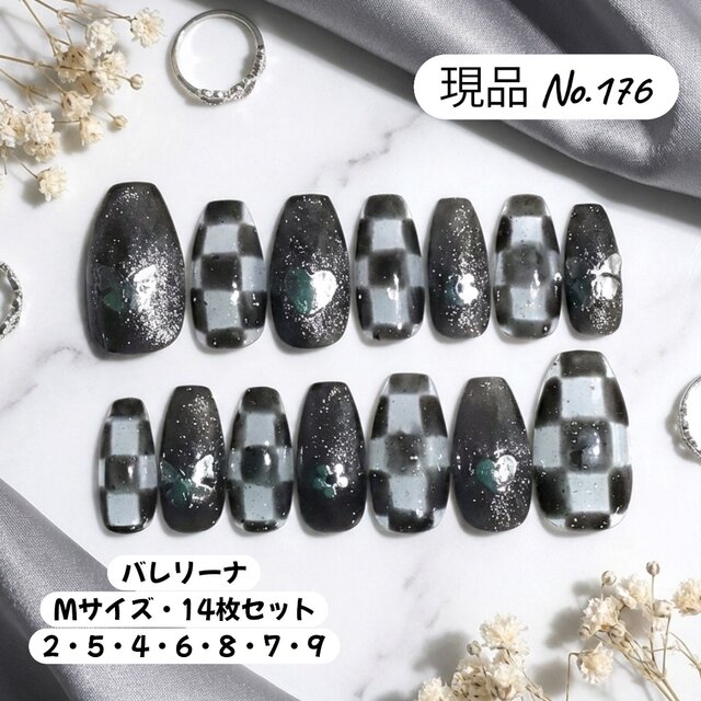 【現品 No.176】モノトーンチェック×ハート ネイル/バレリーナ・Mサイズ・14枚セット/モード系 ジェルネイルチップ