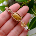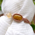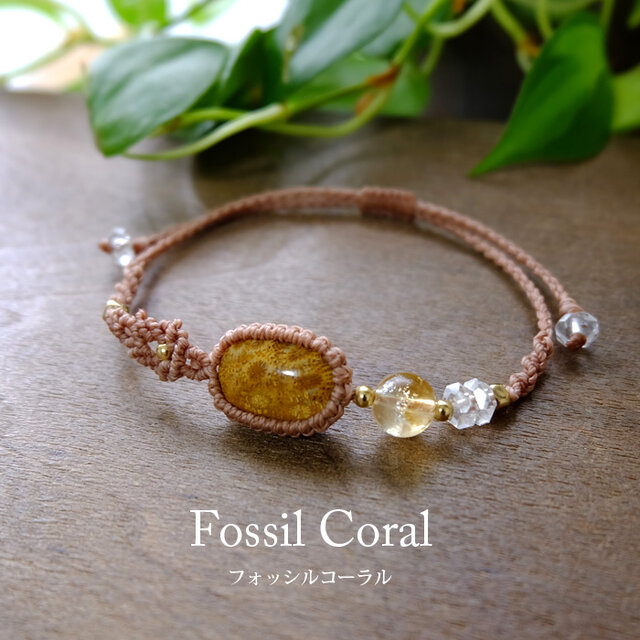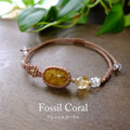 天然にできた菊の花びらやひまわりのような独特の模様が神秘的なインドネシア産フォッシルコーラル(化石珊瑚)と天然のクラックがキラリと輝く魅力的なシトリンを合わせたアシンメトリマクラメ編みブレスレットです。