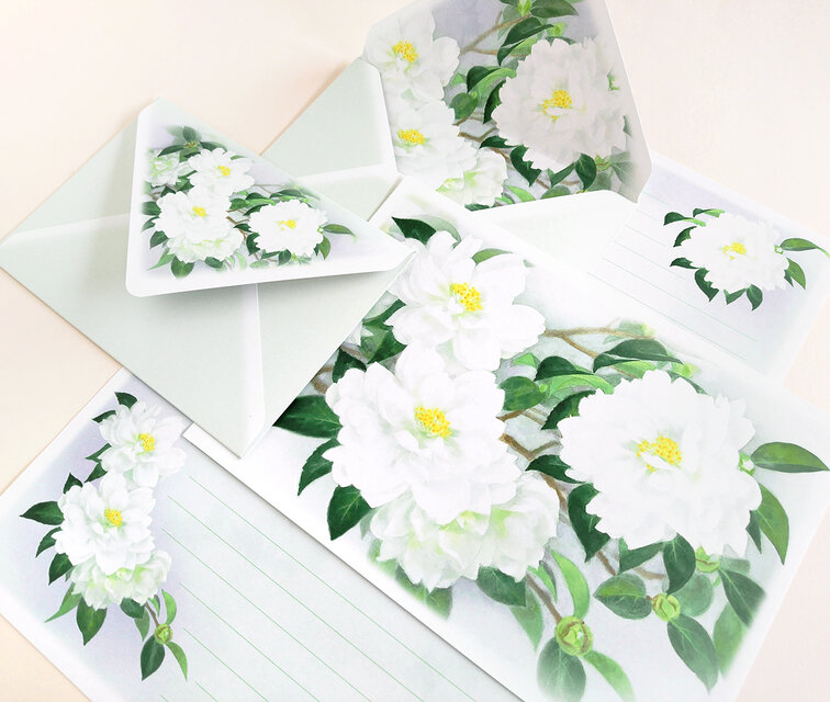 封筒の中にも花を咲かせた山茶花尽くしのレターセットはいかがでしょうか。
