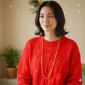 大きさ、形の違うビーズを使って、チェーンのようにし、一粒ずつ5ミリ玉のパールを挟んでいきロングサイズのネックレスに仕立てました。