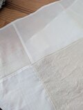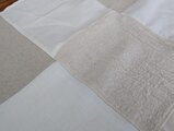 ♥️コットン100%や、コットンリネン(綿麻)のホワイトやベージュ系の生地をたくさん使ったナチュラルでインテリアを選ばないシンプルなパッチワークです。薄手のものから厚手のものまで光りの通し具合や色合いを楽しんで頂けます。また、リネン100%より比較的手軽に扱うことができるコットンリネンなら、洗濯もアイロンも普段通りで大丈夫です。
