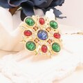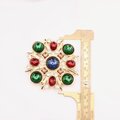 ゴールドトーンのベースに、レッド・グリーン・ブルーのカラージュエルを放射状に配した、華やかで存在感のあるフラワーモチーフ。