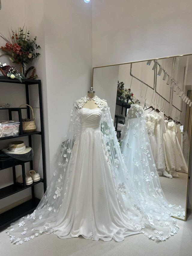 フランス風 ウェディングドレス ケープ風ドレス ベアトップ 花モチーフ ハンドドレープ 憧れのドレス ブライダル