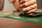 コバの磨き、革裏の処理は炊きだした天然の布糊による仕上げ、艶出しには那智石のグレージング仕上げを、機械ではなく手で一枚一枚こすり上げ艶出しをしています。