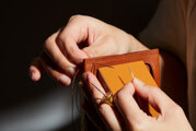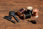 フランス製の麻混の手縫い糸によりすべて手縫いで仕上げてあり、針穴もフランス製の目打ちにより職人が機械を使わずに開けています。