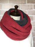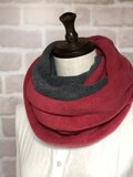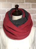 こちらのスヌードはルビーレッドとチャコールグレーの暖かみのあるお色の2色使いですので、いろんな表情が楽しめてコーディネートの幅が広がります。