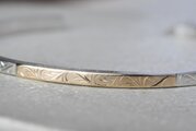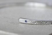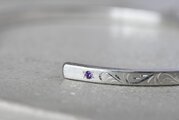 両サイドにアメジストとアイオライトを留め、全周に渡って唐草彫りを和彫りの技術を使って施した作品になります。