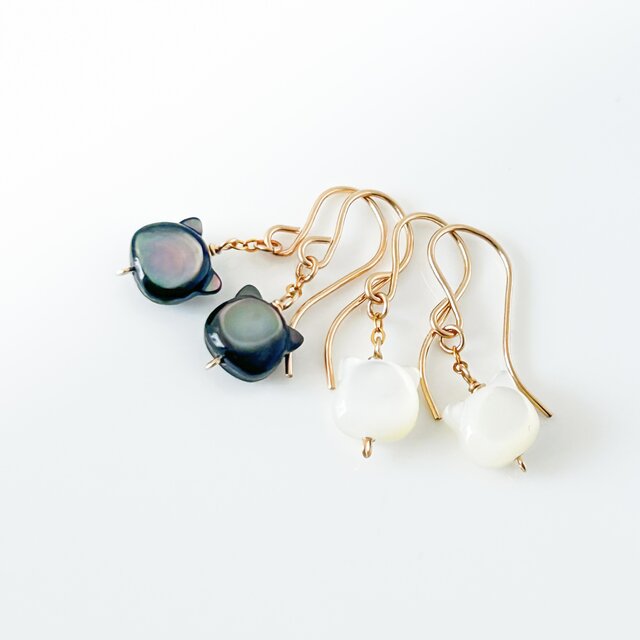 まいにち猫パレード!✧ ころりんシェル猫|ひと粒ピアス(イヤリング)14kgf|白猫 / 黒猫