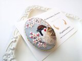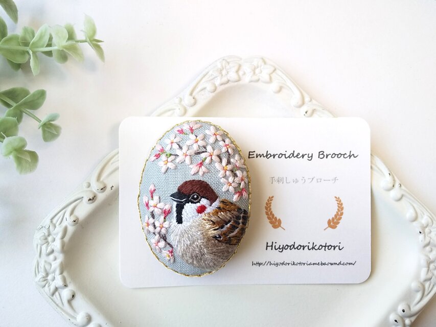 空色のリネンに、ふっくらしたスズメと桜を手刺繍したブローチ。