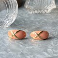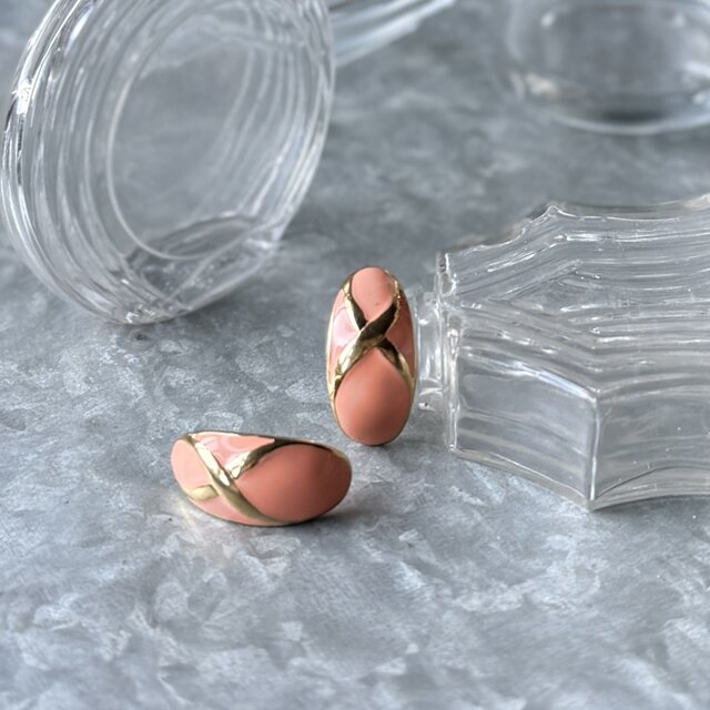 ゴールドトーンをベースに、コーラルピンクのエナメルペイントとクロスデザインが特徴的なピアス。
