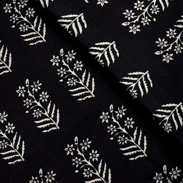 インド ブロックプリント生地 [50cm単位切売] バグルー フラワープランツブラック 花 SA IF0436