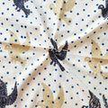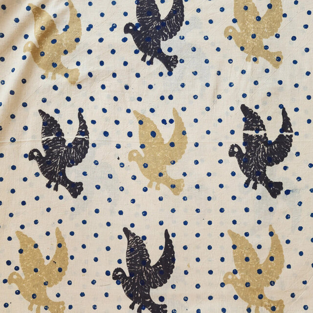 オフホワイト生地に藍染のドット、からしと黒で鳥が描かれています。