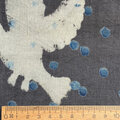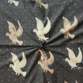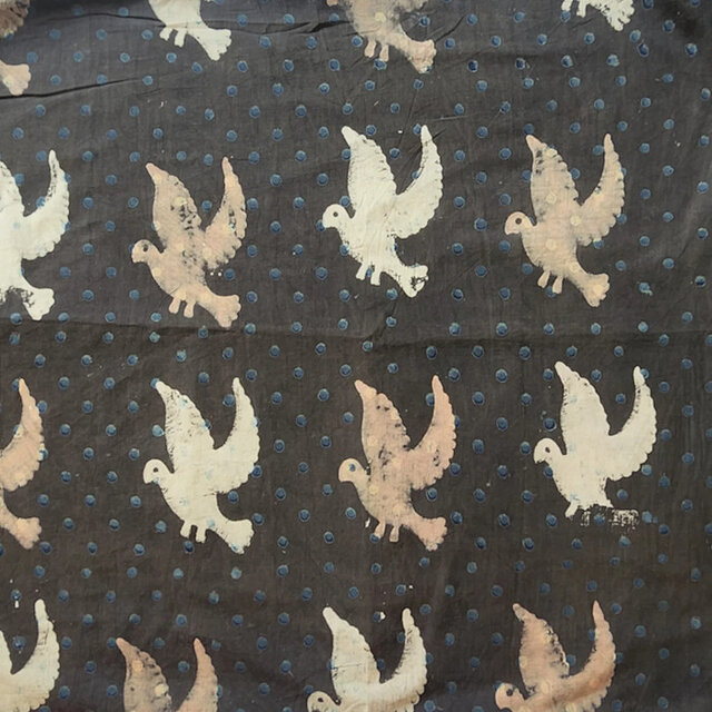 オフホワイト生地が墨色に染められ、藍染のドット、ベージュと白抜きで鳥が描かれています。