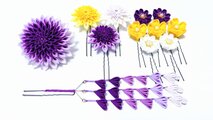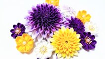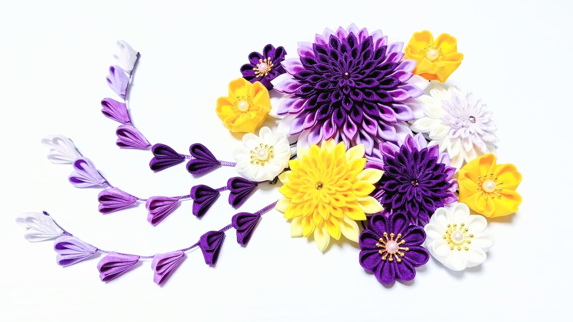 つまみ細工の髪飾り ヘアコームとUピン 12点セット【紫·黄色·白】