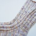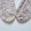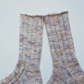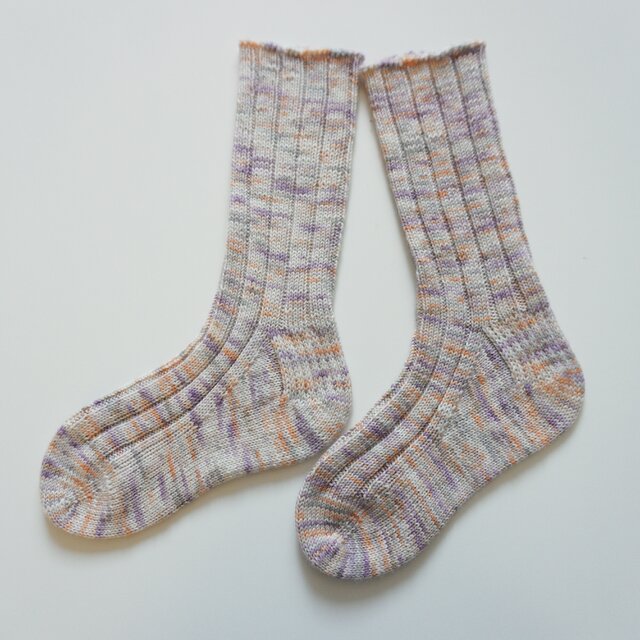 淡い色のオレンジ、パープル、グレーの揺らぎが朝靄の様に優しい印象です。履き口まで同じ編み方にしました。写真では細めに見えますが締め付け感は無いと思います。