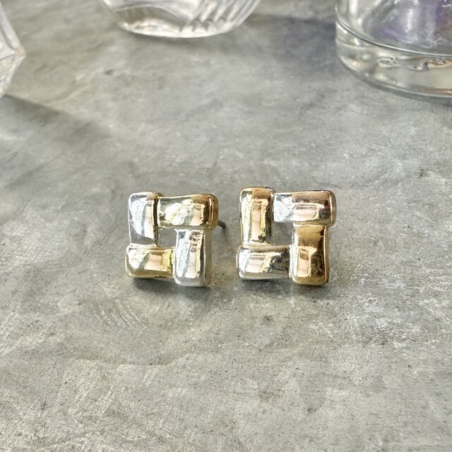 シルバートーンとゴールドトーンの2トーンカラーバスケットウェーブピアス。