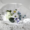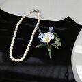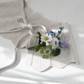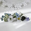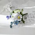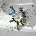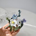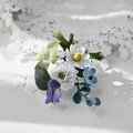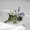 ユーカリ、白詰草、ノースポール、ネモフィラ、野のすみれの5種のお花達をぎゅっと束ねたブーケコサージュを布花に仕立てました。