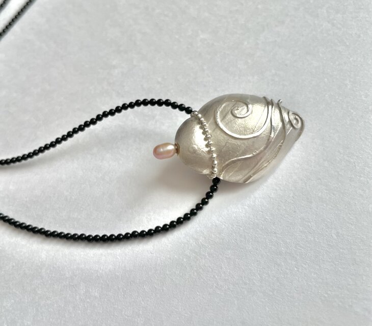 砂漠の風紋をイメージした銀線と水の雫のような銀のボールをネックレスの様に溶接しました。