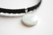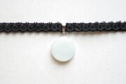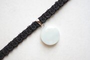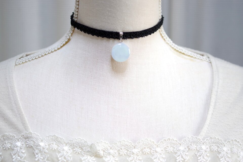 白と見まがうほどに淡い水色が優しい印象を与えるレジンを、ベルベットリボンにタティングレースで装飾を施したチョーカーに仕上げました。
