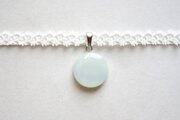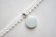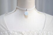 白と見まがうほどに淡い水色が優しい印象を与えるレジンを、サテンリボンにタティングレースで装飾を施したチョーカーに仕上げました。