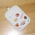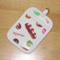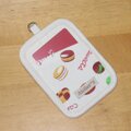 アイボリー地にマカロンやエクレアが描かれたスイーツ柄で作り、生成の無地と合わせました。