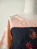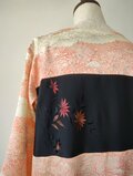 黒地に刺繍の花模様、羽織りだったものです。橙色がかった赤い花と色味がピッタリの総柄の着物を見つけて組み合わせたワンピースとなります。