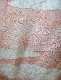 雲の合間に見える家屋と花咲くお庭、線描きの光沢感のある素敵な着物です。