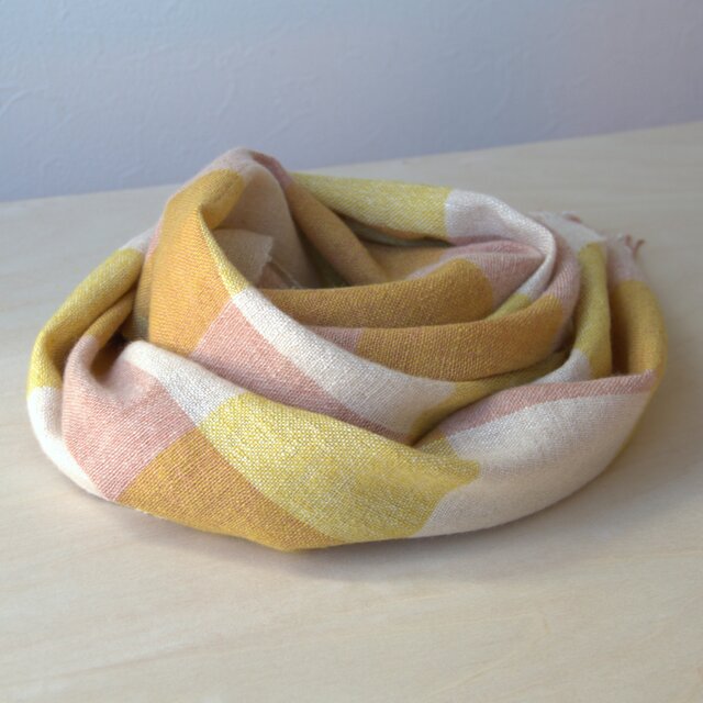 ホームスパン リネン×カシミヤマフラー 茜色と黄色のチェック