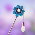 コスモスをテーマにしたかんざしで、シルバーの花に七宝焼きを施し、その中心にはパールがあしらわれたヘアアクセサリーです。下部の揺れる部分にはネフライトが使われており、洗練された印象を与えるかんざしに仕上がっています。職人の手によって一つ一つ丁寧に作られたこのかんざしは、古典的な美しさと現代的なエレガンスが見事に融合しています。和装にも洋装にも合わせやすく、多くの場面で活躍すること間違いなしです。日常の装いに特別な輝きを添えたいときや、特別な日の装いをより引き立てたいときに、このかんざしはその役割を果たしてくれることでしょう。