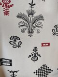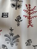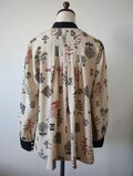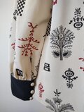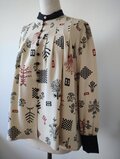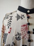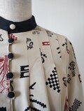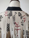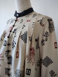 ベージュ地にポップな赤と黒のイラストが可愛い着物で創ったブラウスとなります。柄行きを考えると今風着物のようにも見えますが裏地や縫製状態では古い着物のようにも思えます。ただ当時こんなハイカラなデザインをされる染色家がいたのだろうかと思うととても不思議な着物です。