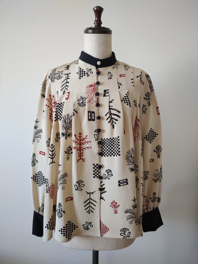 スタンドカラーとカフス、包みボタンには黒の着物正絹生地を使った個性的で幅広い場所で活躍できそうなブラウスとなります。