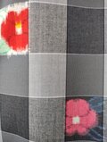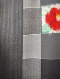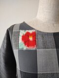 グレーのグラデーションの格子柄に赤と桃色の椿の花が紬織の反物だった新品の生地です。左右に組み合わせたグレーの服地のツイードは裏側が少し起毛しているので暖かく椿の咲く冬のシーズンにもピッタリです。