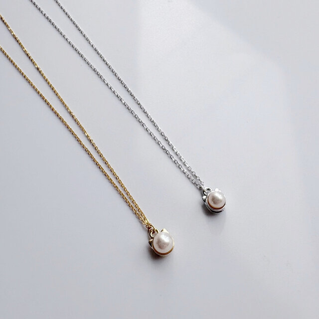 猫をモチーフにした小さめかわいいパールネックレスです。猫背面もぷっくりととても可愛い2wayです。ホワイト、ピンクパールは高品質AAAAAクラスパールを使用し、サイズ5mmで胸元に愛らしいキャット♡シンプルで飽きの来ないデザインですので、パールもネコも大好きな方おすすめです♪
