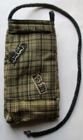 袋の口の片側に、ループの輪をつけ、中にループの端を通して結ぶようにしてバックや腰に下げるようにしています。