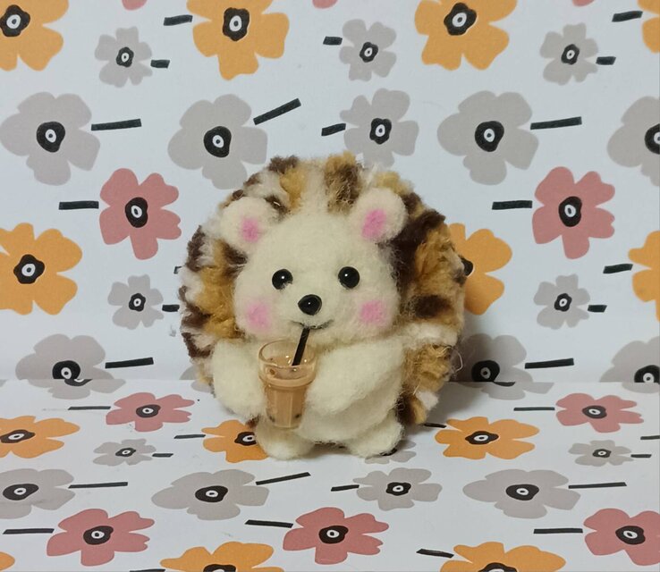 愛らしいハリネズミの羊毛フェルト製ぬいぐるみ、ミニチュア飲み物付き。
