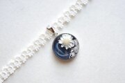 深いコバルトブルーに白いお花と銀箔をあしらった知的で愛らしいレジンを、サテンリボンにタティングレースで装飾を施したチョーカーに仕上げました。
