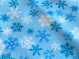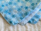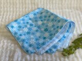 水色の地に無数の雪の結晶が散りばめられた柄のダブルガーゼで、ハンカチを作りました。