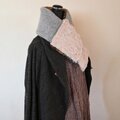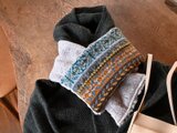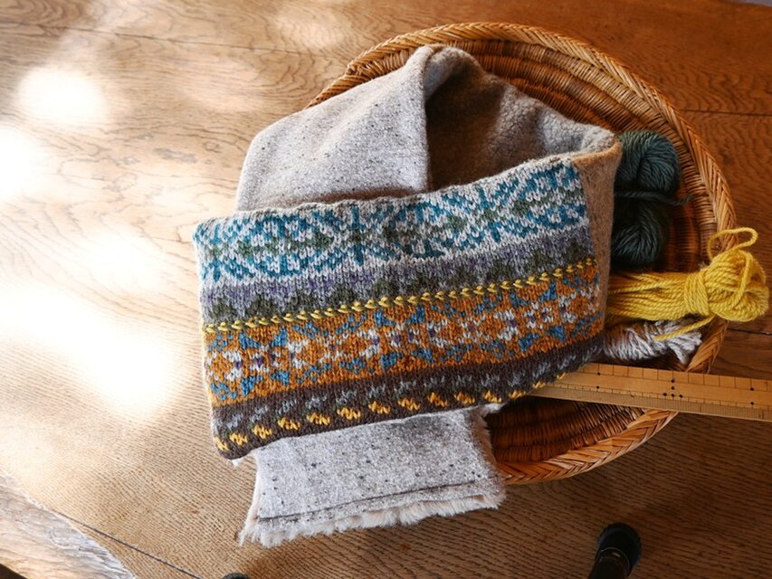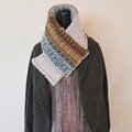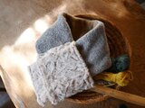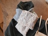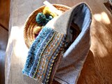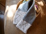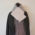 色を楽しむ編み込みのニットと軽くて暖かい布とを組み合わせたマフラーです。